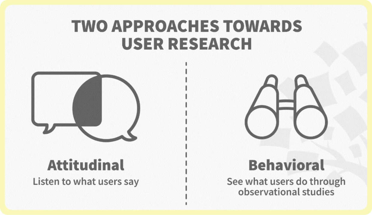 Attitudinal research involves an evaluation of the users’ perceptive attitudes with respect to a particular experience. This is more of a research where a user shares why they like or dislike a certain feature on a website before even using it in the first place.