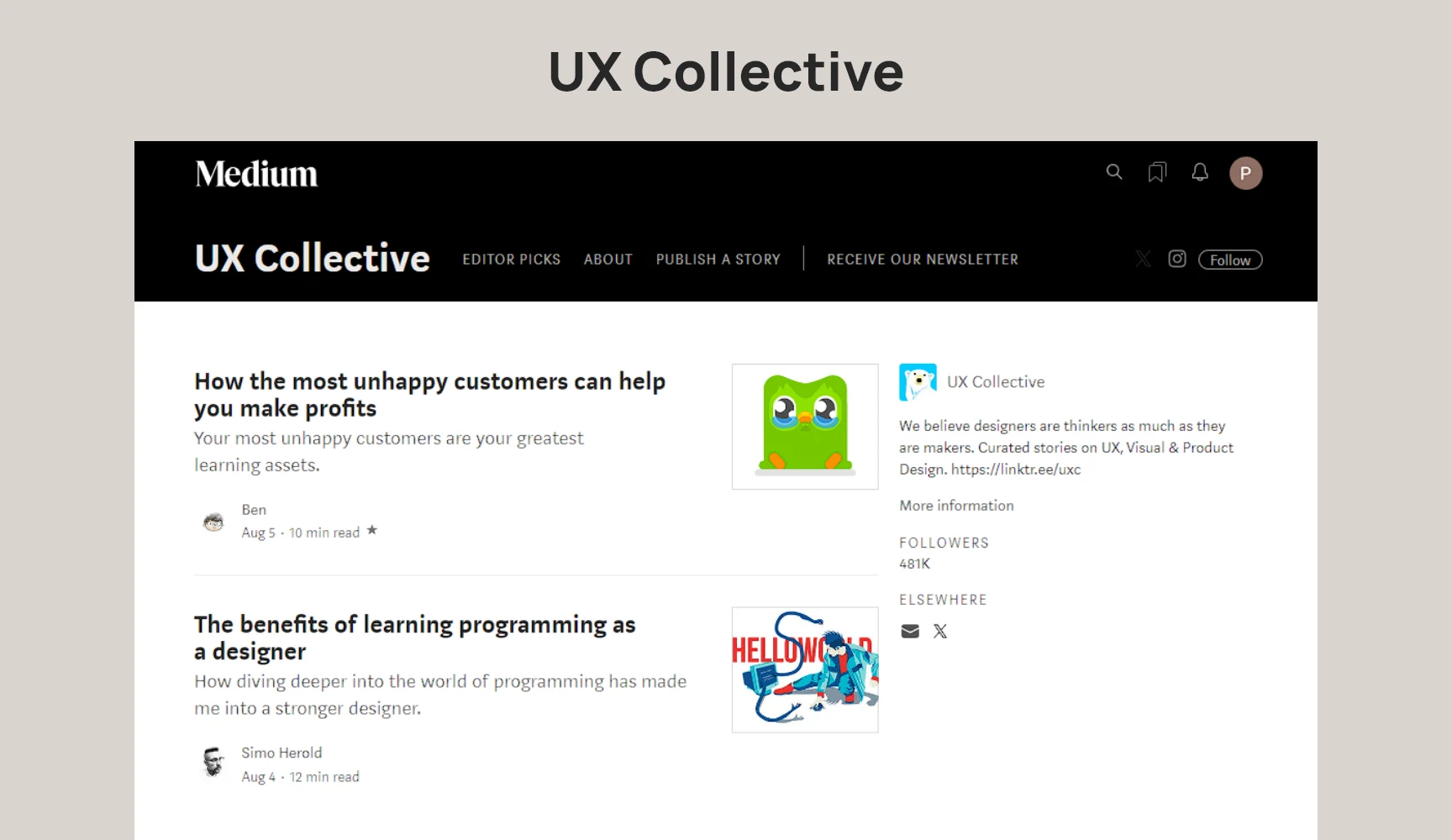 UX Collective aims to sift through the noise and bring the best UX content, making it more accessible and easier for the readers to digest. You'll find insights from professional designers, practical strategies for applying UX in the real world, and deep reflections on the design of popular products and services. Additionally, the platform offers career advice, portfolio tips, and helpful hacks to enhance your UX skills. For a broader perspective on the UX industry, you can also subscribe to their weekly newsletter.